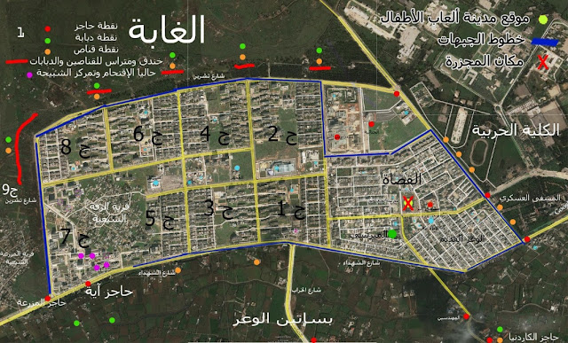 o ان الحي خالي من المظاهر المسلحة داخله ويطفى عليه الواقع المدني بشكل عام إلا ضمن الجبهات والتي تقع جميعها حول الحي كما هو موضح في الخريطة وابتعاد حديقة الألعاب تماماً عنها حيث أنها تقع بجانب كنيسة القديسين بطرس وبولس ومدرسة نوري حوا وهو مقابل للميتم وهو الأن جمعية اغاثية برعاية الأمم المتحدة والهلال الأحمر قريب من مشفى البر الواقع تحت سيطرة النظام ولم يقترب منه المعارضين للنظام سابقاً رغم ضعف تسليحهم داخل المشفى وقلة عددهم يرأسهم ضابط برتبة مقدم